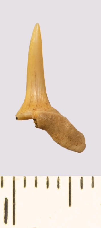 Зуб. Акула. Scapanorhynchus rhaphiodon Agassiz, 1843. Классификация: Хордовые Chordata, Позвоночные Vertebrata, Хрящевые рыбы Chondrichthyes, Пластиножаберные Elasmobranchii