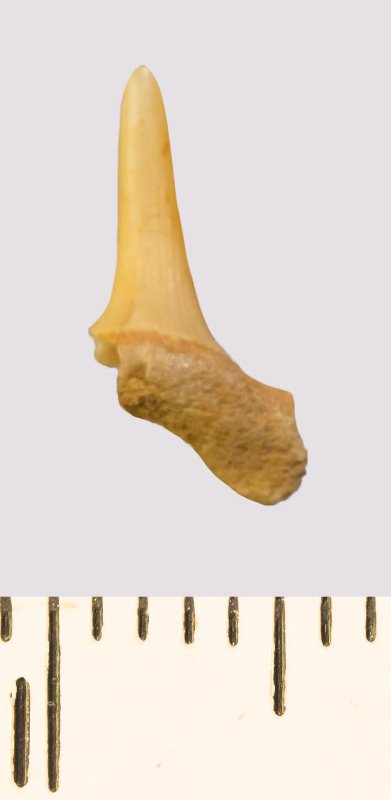 Зуб. Акула. Scapanorhynchus rhaphiodon Agassiz, 1843. Классификация: Хордовые Chordata, Позвоночные Vertebrata, Хрящевые рыбы Chondrichthyes, Пластиножаберные Elasmobranchii