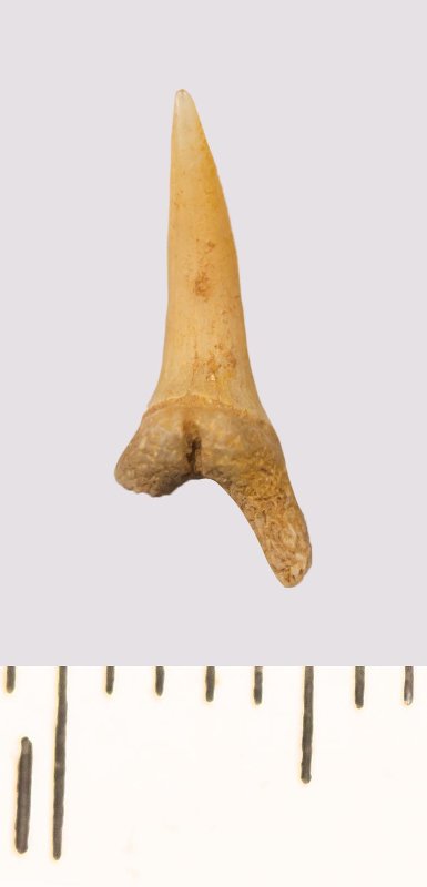 Зуб. Акула. Scapanorhynchus rhaphiodon Agassiz, 1843. Классификация: Хордовые Chordata, Позвоночные Vertebrata, Хрящевые рыбы Chondrichthyes, Пластиножаберные Elasmobranchii