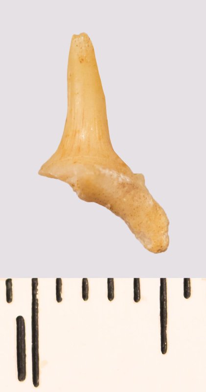Зуб. Акула. Scapanorhynchus rhaphiodon Agassiz, 1843. Классификация: Хордовые Chordata, Позвоночные Vertebrata, Хрящевые рыбы Chondrichthyes, Пластиножаберные Elasmobranchii