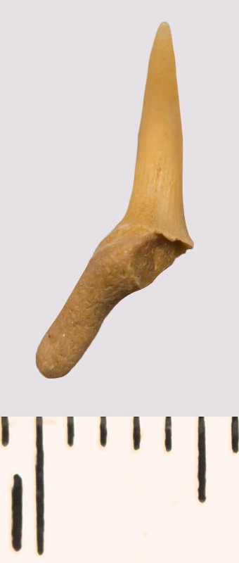 Зуб. Акула. Scapanorhynchus rhaphiodon Agassiz, 1843. Классификация: Хордовые Chordata, Позвоночные Vertebrata, Хрящевые рыбы Chondrichthyes, Пластиножаберные Elasmobranchii