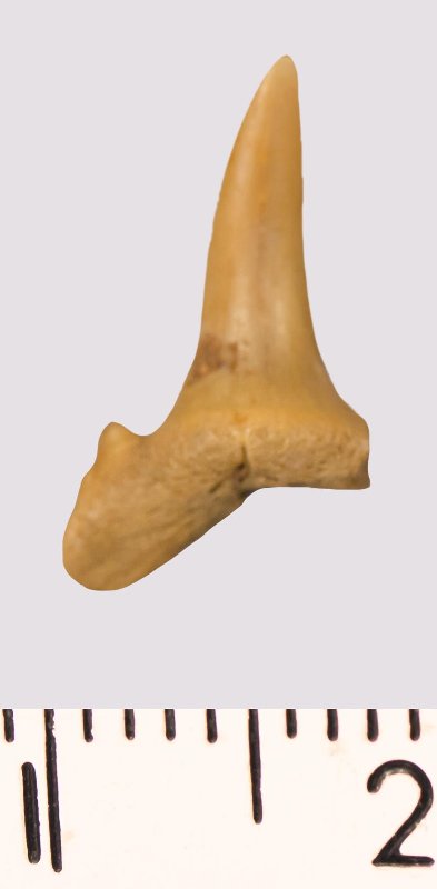 Зуб. Акула. Scapanorhynchus rhaphiodon Agassiz, 1843. Классификация: Хордовые Chordata, Позвоночные Vertebrata, Хрящевые рыбы Chondrichthyes, Пластиножаберные Elasmobranchii
