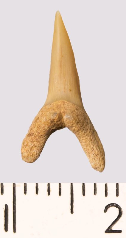 Зуб. Акула. Scapanorhynchus rhaphiodon Agassiz, 1843. Классификация: Хордовые Chordata, Позвоночные Vertebrata, Хрящевые рыбы Chondrichthyes, Пластиножаберные Elasmobranchii