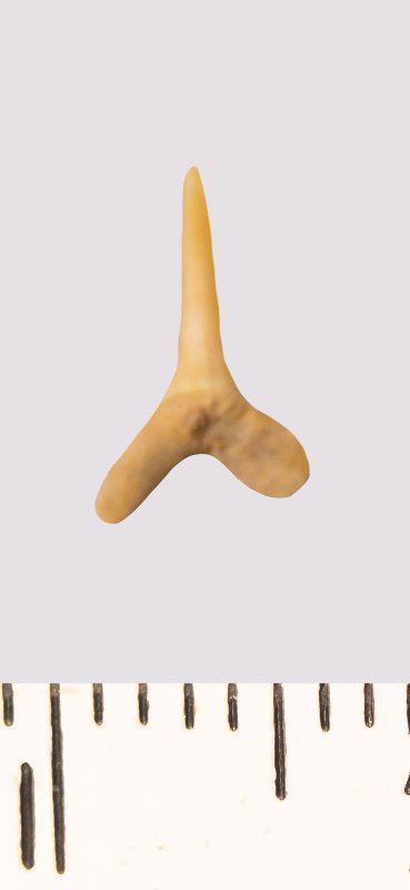 Зуб. Акула. Scapanorhynchus rhaphiodon Agassiz, 1843. Классификация: Хордовые Chordata, Позвоночные Vertebrata, Хрящевые рыбы Chondrichthyes, Пластиножаберные Elasmobranchii
