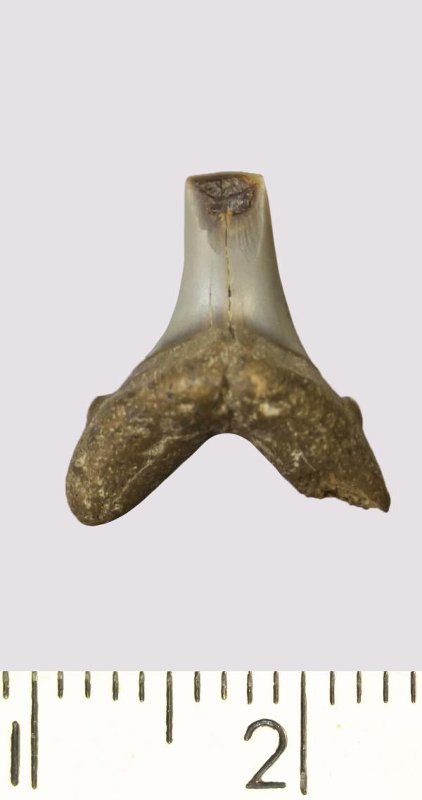Зуб. Акула. Odontaspis venusta (Leriche, 1929). Классификация: Хордовые Chordata, Позвоночные Vertebrata, Хрящевые рыбы Chondrichthyes, Пластиножаберные Elasmobranchii