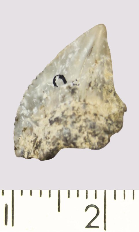 Зуб (фрагмент). Акула. Anacorax kaupi (Agassiz, 1843). Классификация: Хордовые Chordata, Позвоночные Vertebrata, Хрящевые рыбы Chondrichthyes, Пластиножаберные Elasmobranchii
