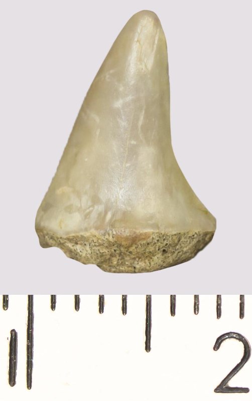 Зуб (фрагмент). Акула. Lamniformes gen. et sp. indet. Классификация: Хордовые Chordata, Позвоночные Vertebrata, Хрящевые рыбы Chondrichthyes, Пластиножаберные Elasmobranchii