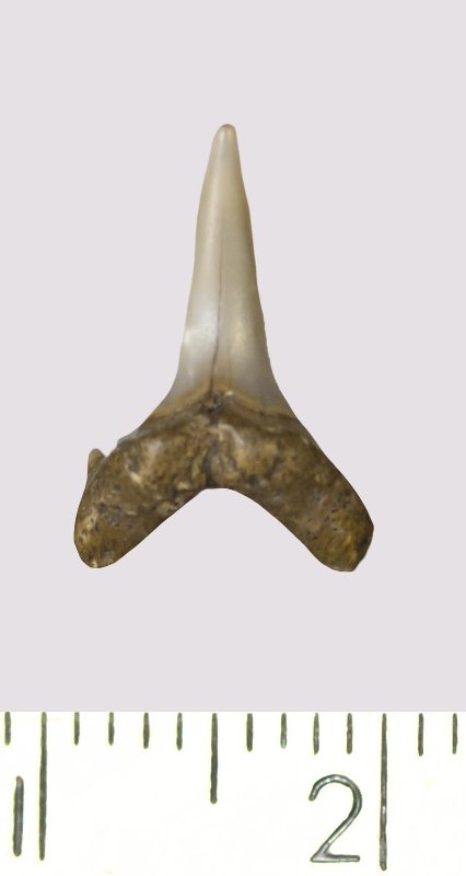 Зуб. Акула. Odontaspis venusta (Leriche, 1929). Классификация: Хордовые Chordata, Позвоночные Vertebrata, Хрящевые рыбы Chondrichthyes, Пластиножаберные Elasmobranchii