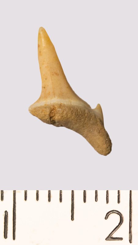 Зуб. Акула. Odontaspis striatula Dalinkevicius, 1935. Классификация: Хордовые Chordata, Позвоночные Vertebrata, Хрящевые рыбы Chondrichthyes, Пластиножаберные Elasmobranchii