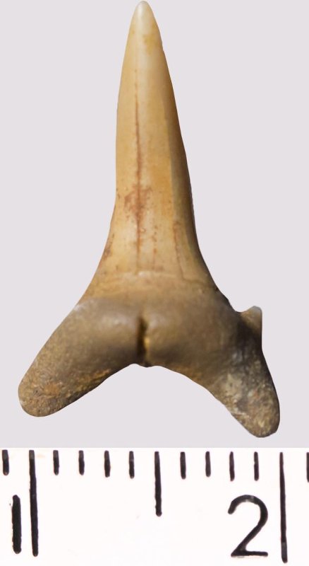 Зуб. Акула. Odontaspis striatula Dalinkevicius, 1935. Классификация: Хордовые Chordata, Позвоночные Vertebrata, Хрящевые рыбы Chondrichthyes, Пластиножаберные Elasmobranchii