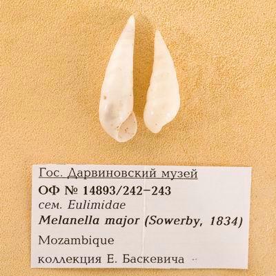 Морской брюхоногий моллюск. Melanella major (Sowerby, 1834). Классификация: Моллюски Mollusca, Брюхоногие Gastropoda, Neotaenioglossa, Eulimidae