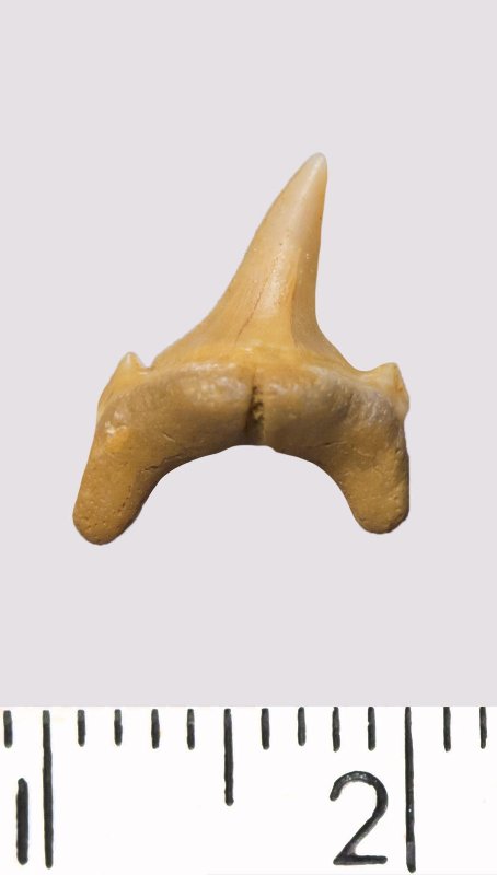 Зуб. Акула. Odontaspis striatula Dalinkevicius, 1935. Классификация: Хордовые Chordata, Позвоночные Vertebrata, Хрящевые рыбы Chondrichthyes, Пластиножаберные Elasmobranchii