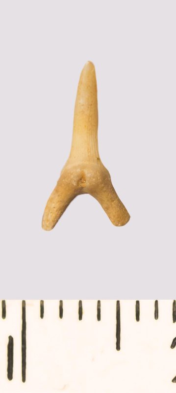 Зуб. Акула. Scapanorhynchus rhaphiodon Agassiz, 1843. Классификация: Хордовые Chordata, Позвоночные Vertebrata, Хрящевые рыбы Chondrichthyes, Пластиножаберные Elasmobranchii