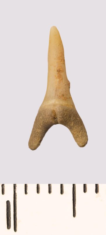 Зуб. Акула. Scapanorhynchus rhaphiodon Agassiz, 1843. Классификация: Хордовые Chordata, Позвоночные Vertebrata, Хрящевые рыбы Chondrichthyes, Пластиножаберные Elasmobranchii