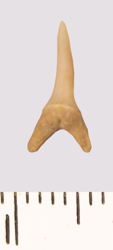 Зуб. Акула. Scapanorhynchus rhaphiodon Agassiz, 1843. Классификация: Хордовые Chordata, Позвоночные Vertebrata, Хрящевые рыбы Chondrichthyes, Пластиножаберные Elasmobranchii