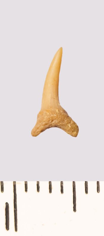 Зуб. Акула. Scapanorhynchus rhaphiodon Agassiz, 1843. Классификация: Хордовые Chordata, Позвоночные Vertebrata, Хрящевые рыбы Chondrichthyes, Пластиножаберные Elasmobranchii