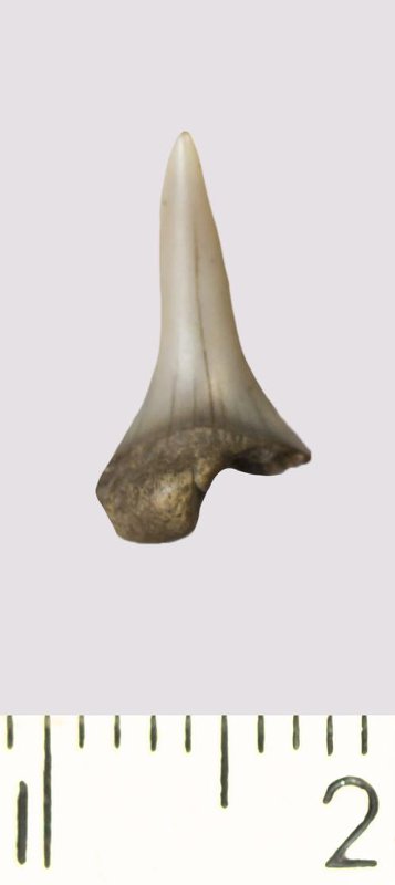 Зуб (фрагмент). Акула. Odontaspis venusta (Leriche, 1929). Классификация: Хордовые Chordata, Позвоночные Vertebrata, Хрящевые рыбы Chondrichthyes, Пластиножаберные Elasmobranchii