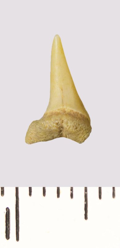 Зуб. Акула. Scapanorhynchus rhaphiodon Agassiz, 1843. Классификация: Хордовые Chordata, Позвоночные Vertebrata, Хрящевые рыбы Chondrichthyes, Пластиножаберные Elasmobranchii