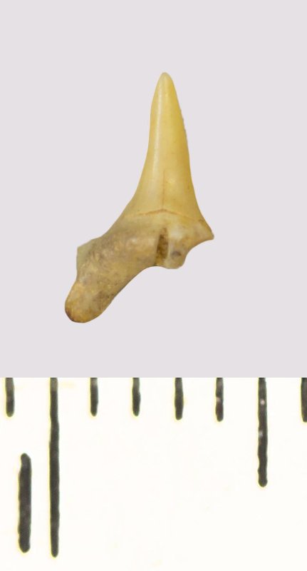 Зуб. Акула. Scapanorhynchus rhaphiodon Agassiz, 1843. Классификация: Хордовые Chordata, Позвоночные Vertebrata, Хрящевые рыбы Chondrichthyes, Пластиножаберные Elasmobranchii