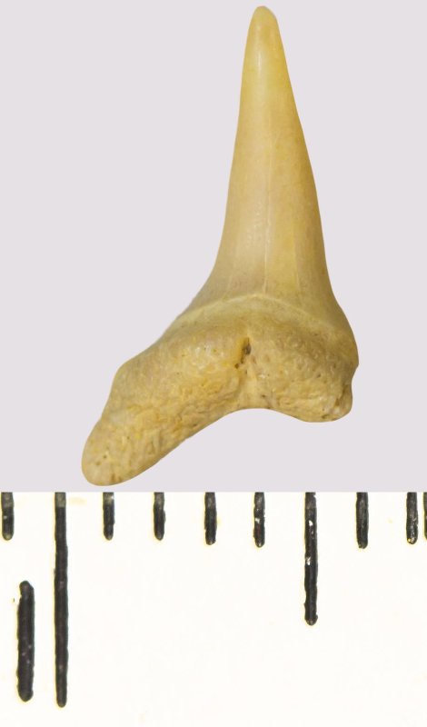 Зуб. Акула. Scapanorhynchus rhaphiodon Agassiz, 1843. Классификация: Хордовые Chordata, Позвоночные Vertebrata, Хрящевые рыбы Chondrichthyes, Пластиножаберные Elasmobranchii