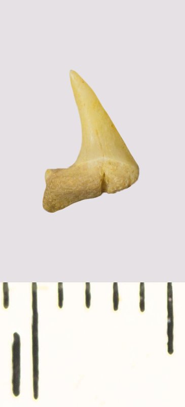Зуб. Акула. Scapanorhynchus rhaphiodon Agassiz, 1843. Классификация: Хордовые Chordata, Позвоночные Vertebrata, Хрящевые рыбы Chondrichthyes, Пластиножаберные Elasmobranchii