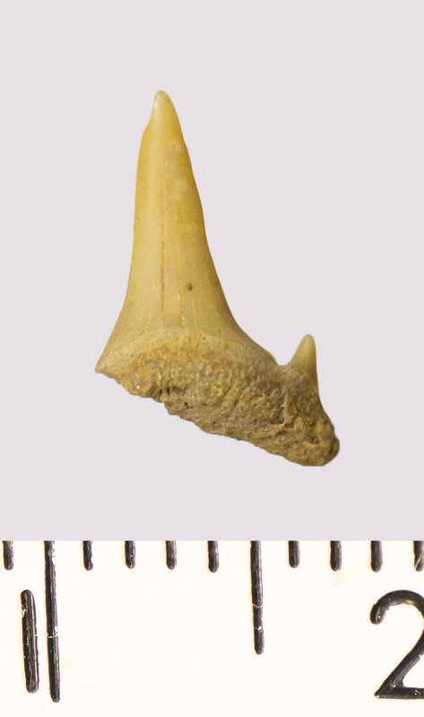 Зуб. Акула. Scapanorhynchus rhaphiodon Agassiz, 1843. Классификация: Хордовые Chordata, Позвоночные Vertebrata, Хрящевые рыбы Chondrichthyes, Пластиножаберные Elasmobranchii