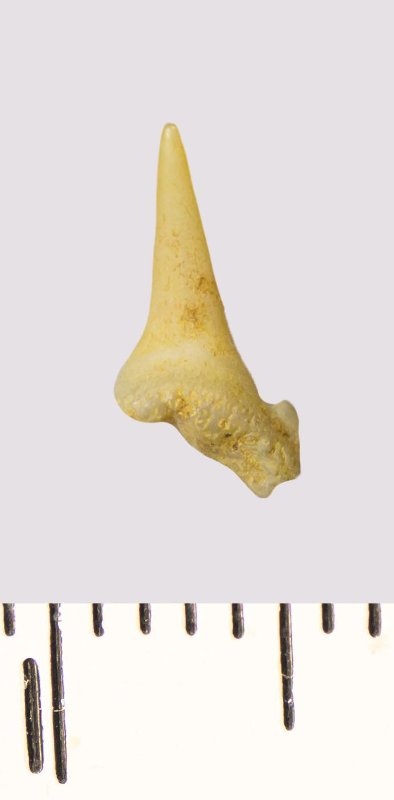 Зуб. Акула. Scapanorhynchus rhaphiodon Agassiz, 1843. Классификация: Хордовые Chordata, Позвоночные Vertebrata, Хрящевые рыбы Chondrichthyes, Пластиножаберные Elasmobranchii