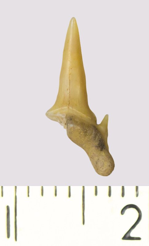 Зуб. Акула. Scapanorhynchus rhaphiodon Agassiz, 1843. Классификация: Хордовые Chordata, Позвоночные Vertebrata, Хрящевые рыбы Chondrichthyes, Пластиножаберные Elasmobranchii