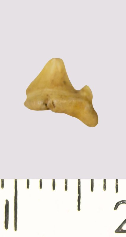 Зуб. Акула. Scapanorhynchus rhaphiodon Agassiz, 1843. Классификация: Хордовые Chordata, Позвоночные Vertebrata, Хрящевые рыбы Chondrichthyes, Пластиножаберные Elasmobranchii
