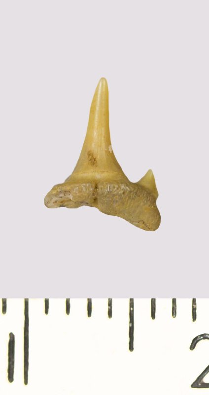 Зуб. Акула. Scapanorhynchus rhaphiodon Agassiz, 1843. Классификация: Хордовые Chordata, Позвоночные Vertebrata, Хрящевые рыбы Chondrichthyes, Пластиножаберные Elasmobranchii