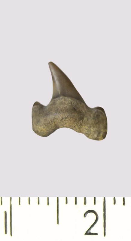 Зуб. Акула. Odontaspis macrorhiza (Cope) Leriche, 1902. Классификация: Хордовые Chordata, Позвоночные Vertebrata, Хрящевые рыбы Chondrichthyes, Пластиножаберные Elasmobranchii