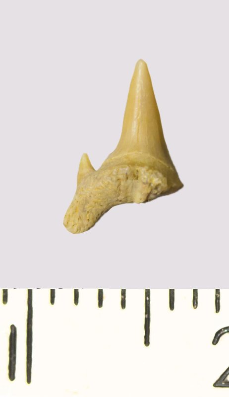 Зуб. Акула. Scapanorhynchus rhaphiodon Agassiz, 1843. Классификация: Хордовые Chordata, Позвоночные Vertebrata, Хрящевые рыбы Chondrichthyes, Пластиножаберные Elasmobranchii