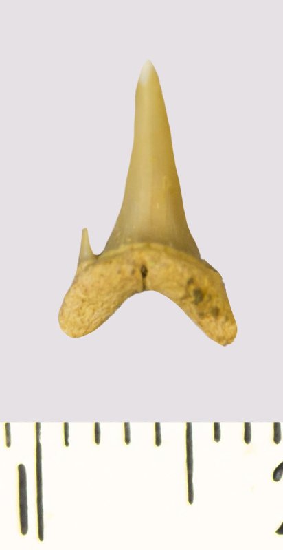 Зуб. Акула. Scapanorhynchus rhaphiodon Agassiz, 1843. Классификация: Хордовые Chordata, Позвоночные Vertebrata, Хрящевые рыбы Chondrichthyes, Пластиножаберные Elasmobranchii