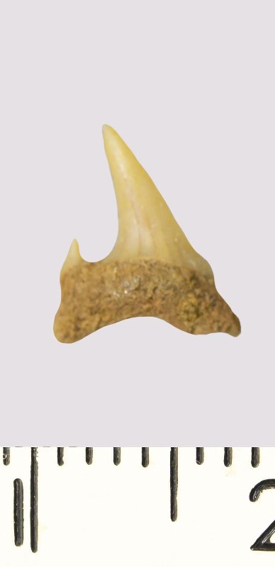 Зуб. Акула. Scapanorhynchus rhaphiodon Agassiz, 1843. Классификация: Хордовые Chordata, Позвоночные Vertebrata, Хрящевые рыбы Chondrichthyes, Пластиножаберные Elasmobranchii