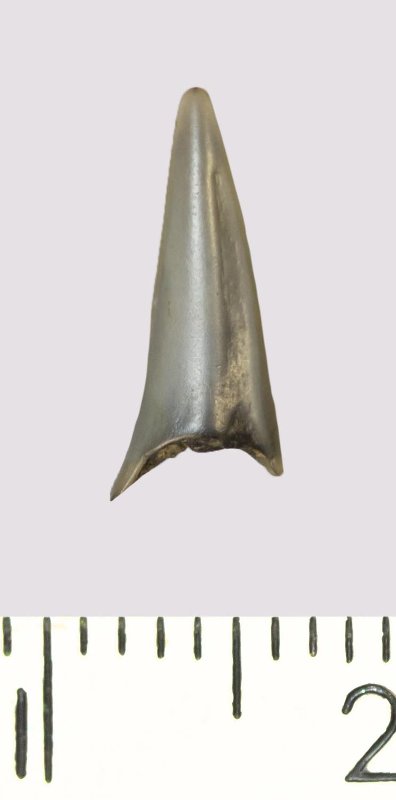 Зуб (фрагмент). Акула. Odontaspis venusta (Leriche, 1929). Классификация: Хордовые Chordata, Позвоночные Vertebrata, Хрящевые рыбы Chondrichthyes, Пластиножаберные Elasmobranchii