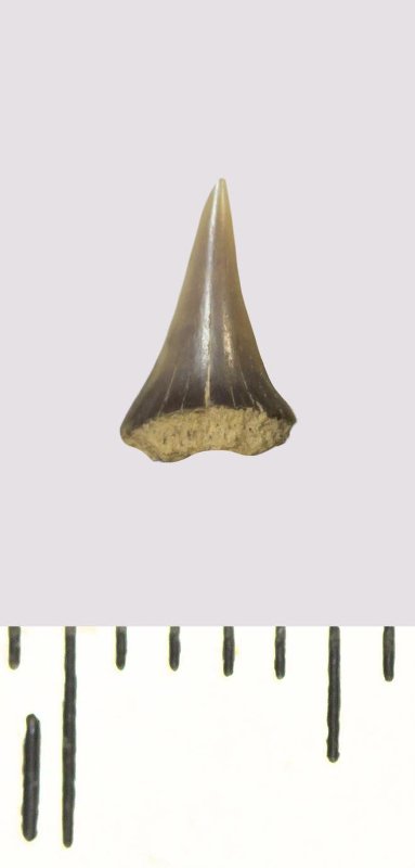 Зуб (фрагмент). Акула. Odontaspis venusta (Leriche, 1929). Классификация: Хордовые Chordata, Позвоночные Vertebrata, Хрящевые рыбы Chondrichthyes, Пластиножаберные Elasmobranchii