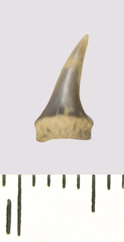 Зуб (фрагмент). Акула. Odontaspis venusta (Leriche, 1929). Классификация: Хордовые Chordata, Позвоночные Vertebrata, Хрящевые рыбы Chondrichthyes, Пластиножаберные Elasmobranchii