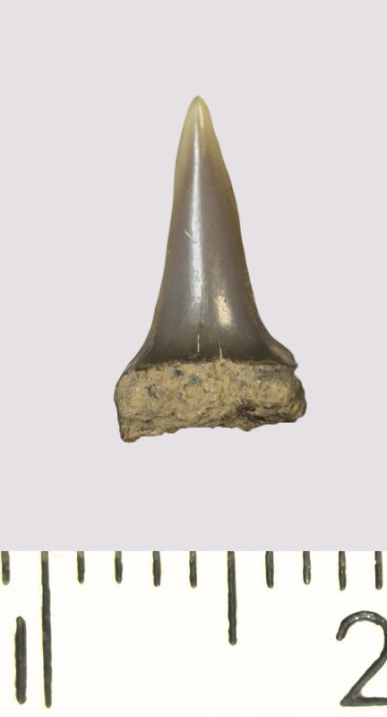 Зуб (фрагмент). Акула. Odontaspis venusta (Leriche, 1929). Классификация: Хордовые Chordata, Позвоночные Vertebrata, Хрящевые рыбы Chondrichthyes, Пластиножаберные Elasmobranchii