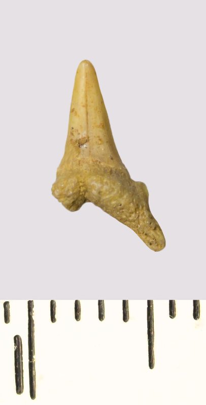 Зуб. Акула. Scapanorhynchus rhaphiodon Agassiz, 1843. Классификация: Хордовые Chordata, Позвоночные Vertebrata, Хрящевые рыбы Chondrichthyes, Пластиножаберные Elasmobranchii