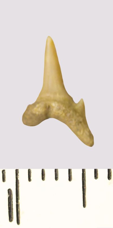 Зуб. Акула. Scapanorhynchus rhaphiodon Agassiz, 1843. Классификация: Хордовые Chordata, Позвоночные Vertebrata, Хрящевые рыбы Chondrichthyes, Пластиножаберные Elasmobranchii