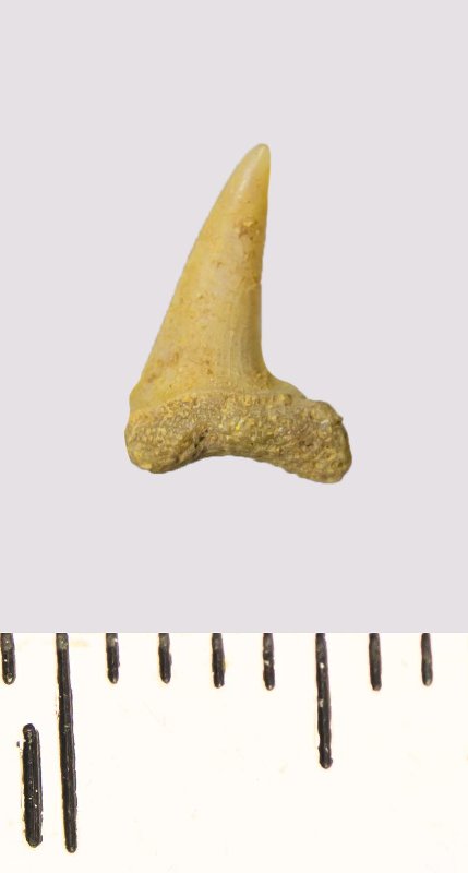Зуб. Акула. Scapanorhynchus rhaphiodon Agassiz, 1843. Классификация: Хордовые Chordata, Позвоночные Vertebrata, Хрящевые рыбы Chondrichthyes, Пластиножаберные Elasmobranchii