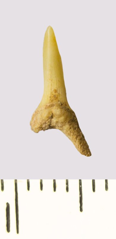 Зуб. Акула. Scapanorhynchus rhaphiodon Agassiz, 1843. Классификация: Хордовые Chordata, Позвоночные Vertebrata, Хрящевые рыбы Chondrichthyes, Пластиножаберные Elasmobranchii