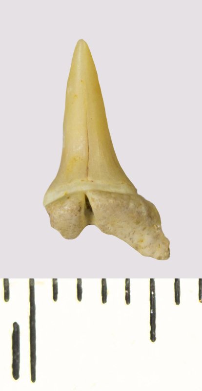 Зуб. Акула. Scapanorhynchus rhaphiodon Agassiz, 1843. Классификация: Хордовые Chordata, Позвоночные Vertebrata, Хрящевые рыбы Chondrichthyes, Пластиножаберные Elasmobranchii