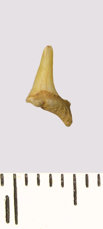 Зуб. Акула. Scapanorhynchus rhaphiodon Agassiz, 1843. Классификация: Хордовые Chordata, Позвоночные Vertebrata, Хрящевые рыбы Chondrichthyes, Пластиножаберные Elasmobranchii