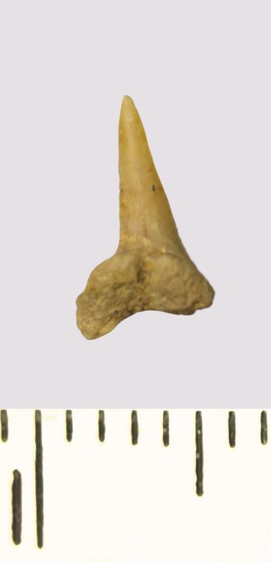 Зуб. Акула. Scapanorhynchus rhaphiodon Agassiz, 1843. Классификация: Хордовые Chordata, Позвоночные Vertebrata, Хрящевые рыбы Chondrichthyes, Пластиножаберные Elasmobranchii