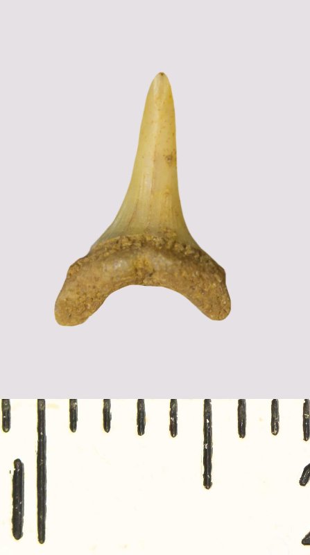 Зуб. Акула. Scapanorhynchus rhaphiodon Agassiz, 1843. Классификация: Хордовые Chordata, Позвоночные Vertebrata, Хрящевые рыбы Chondrichthyes, Пластиножаберные Elasmobranchii