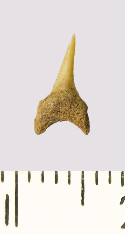 Зуб. Акула. Scapanorhynchus rhaphiodon Agassiz, 1843. Классификация: Хордовые Chordata, Позвоночные Vertebrata, Хрящевые рыбы Chondrichthyes, Пластиножаберные Elasmobranchii