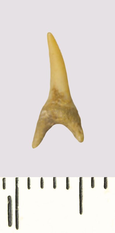 Зуб. Акула. Scapanorhynchus rhaphiodon Agassiz, 1843. Классификация: Хордовые Chordata, Позвоночные Vertebrata, Хрящевые рыбы Chondrichthyes, Пластиножаберные Elasmobranchii