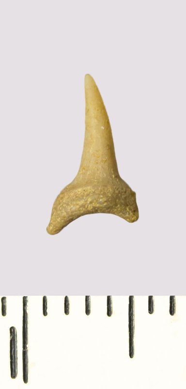 Зуб. Акула. Scapanorhynchus rhaphiodon Agassiz, 1843. Классификация: Хордовые Chordata, Позвоночные Vertebrata, Хрящевые рыбы Chondrichthyes, Пластиножаберные Elasmobranchii