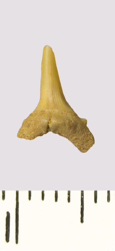 Зуб. Акула. Scapanorhynchus rhaphiodon Agassiz, 1843. Классификация: Хордовые Chordata, Позвоночные Vertebrata, Хрящевые рыбы Chondrichthyes, Пластиножаберные Elasmobranchii